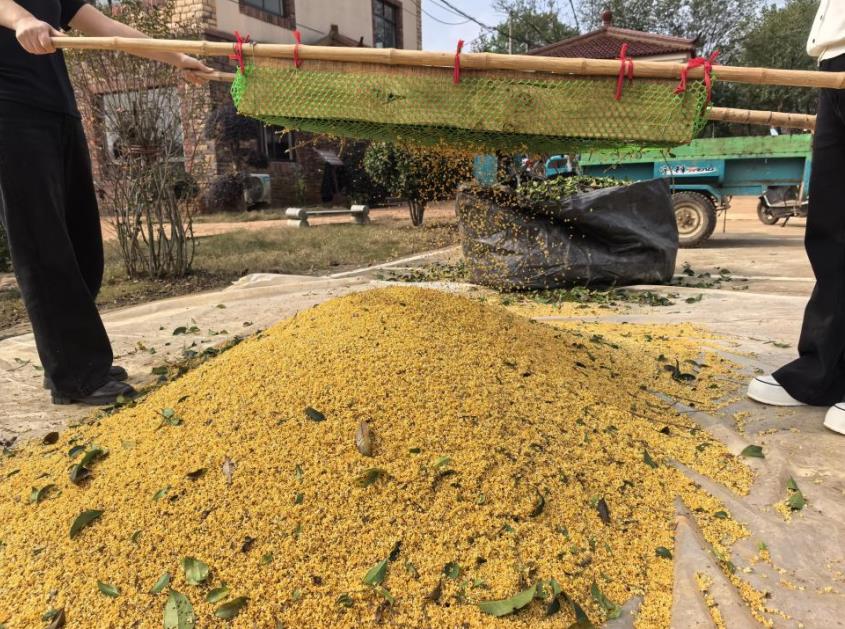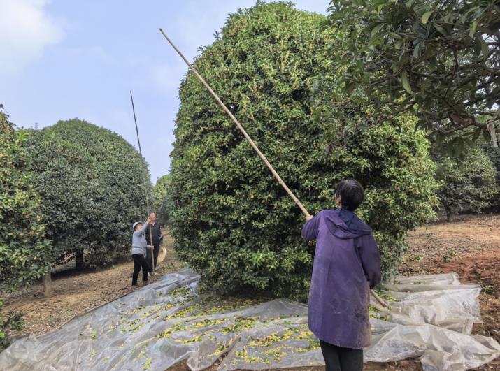 “這活兒干起來不覺得累,整天聞著桂花香,心情都好!”正在打桂花的村民徐小鳳說,“我是附近的,在桂花園裡做了七八年了,平時就在園裡薅薅草、干干農活嘛,一天掙個一百出頭,離家近,還能補貼家用,非常滿意。”