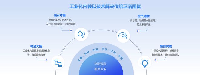 针对“好建造”中“不霉、不堵、不漏、不吵、不裂、不臭”的六不要求,华耐智装整体卫浴以技术解决传统卫浴困扰,具有畅通无阻、滴水不漏、空气清新、隔音减震的优势,满足高品质居住需求。