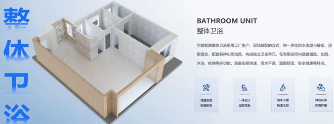 华耐智装整体卫浴采用工厂生产、现场装配的方式,将一体化防水底盘与壁板、顶板组合,配套各种功能洁具,构成独立卫生单元,在有限空间内涵盖盥洗、如厕、沐浴、收纳等多种功能,具备安装快速、滴水不漏、温暖舒适、安全健康等特点。